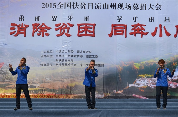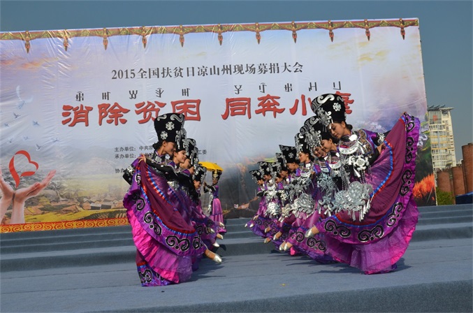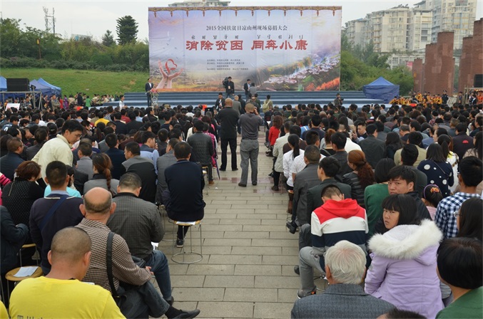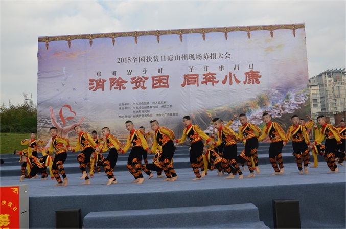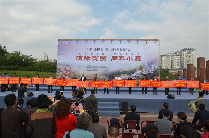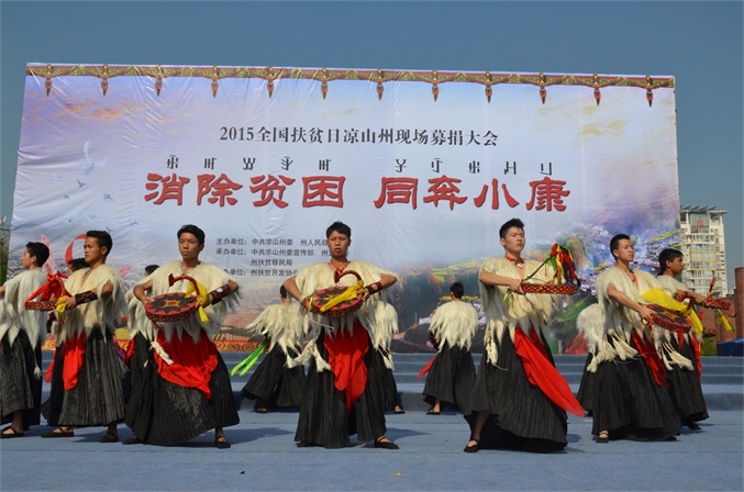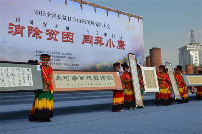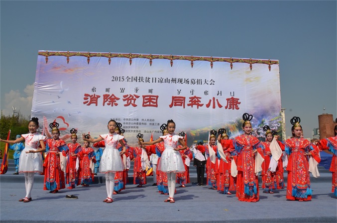 10月17日, 由凉山州委、州政府主办,州委宣传部、州直工委、州扶贫移民局承办,州扶贫开发协会、州文广传媒集团协办的2015年全国“扶贫日”凉山现场募捐大会,在西昌市火把广场举办。 募捐大会的主题是“消除贫困、同奔小康”。州委、州人大、州政府、州政协领导,州级各机关、事业单位、企业和驻昌部队代表,以及4000多名观众参加大会,观看了扶贫义演。募捐大会由肖春副州长主持,州委常委、州国资委党委书记胡坤作了重要讲话。 扶贫义演由中央电视台节目主持人、凉山州扶贫开发协会形象大使沙玛阿果主持,国内文艺界知名的苏都阿洛、吉杰、莫西子诗、彝人制造、太阳部落、阿依洛组合等彝族歌唱家,及凉山州歌舞团、省彝文学校、西昌市第二小学等单位参加义演。沙玛阿果富有感染力的主持,和演员们热情洋溢的表演,让全场观众不仅感受到了艺术的魅力,更感到了浓浓的暖意,激发起人们参与扶贫捐赠的热情。许多观众纷纷上前向募捐箱投币,更有的人一次性举牌,捐赠数万元的资金。 凉山州此次扶贫日系列活动启动以来,有许多州内外爱心企业、爱心人士,州级党政机关、事业单位干部职工慷慨解囊,积极捐赠,截至今天募捐大会为止,共募集定向和非定向资金(含物资折价)2052.09712万元。此项资金,州政府将根据捐赠者意愿,统筹安排,全部用于扶贫济困,帮助贫困群众脱贫致富,帮扶家庭贫困学生完成学业等。所有资金募集、使用情况,将向社会公示。